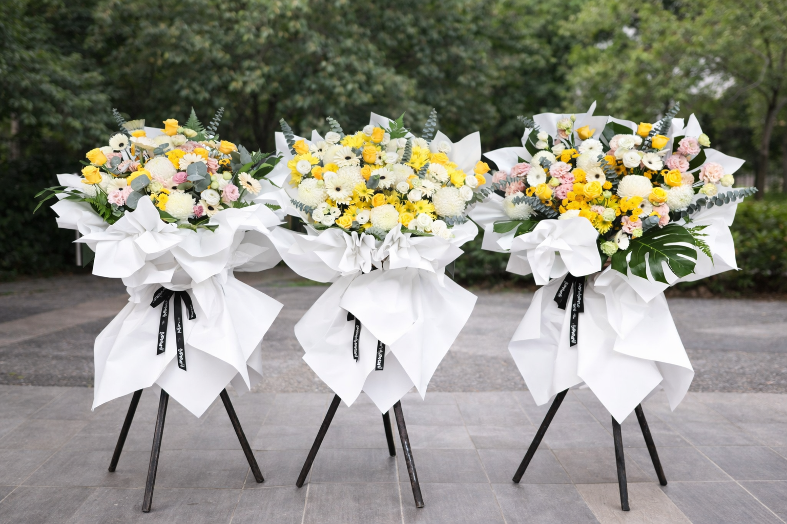 Crafted with a harmonious arrangement of fresh blooms in soothing tones, this condolence stand serves as a graceful tribute at funeral services, wakes, or memorial ceremonies.
