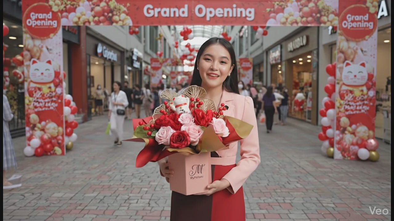 - 1 Unit Fortune Cat, 6 Stalks Soap Rose, 2 Stalks Peony, Filler and Decorations